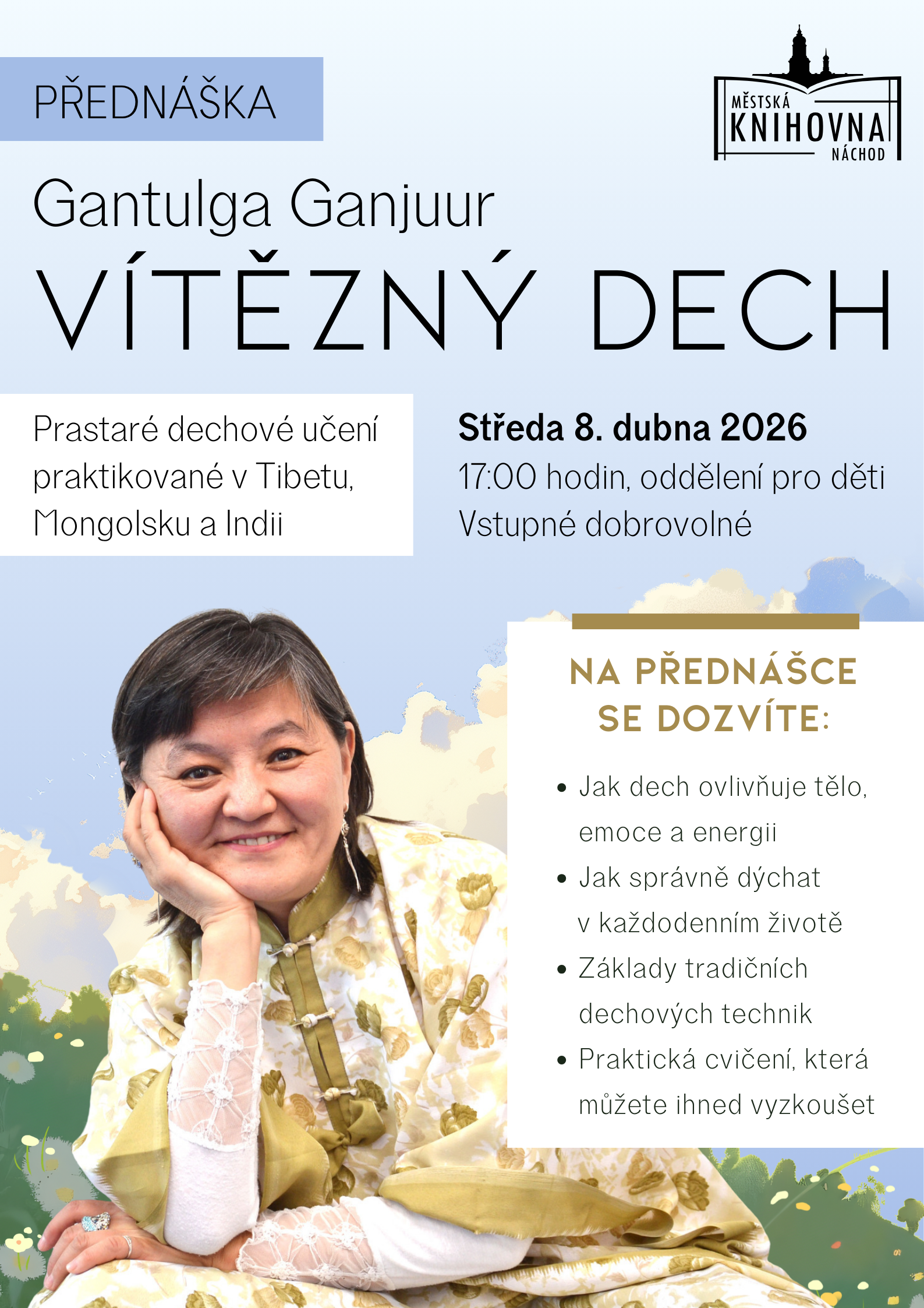 Ve středu 8. dubna proběhne od 17:00 hodin ve studovně přednáška, která představí prastaré dechové učení vycházející z tradic Tibetu, Mongolska a Indie. Zkušená lektorka Gantulga Ganjuur se zaměří na význam vědomé práce s dechem a na to, jak může ovlivnit naše zdraví, psychickou pohodu i každodenní prožívání. Účastníci se seznámí se základy tradičních dechových technik a dozvědí se, jak dech působí na tělo, emoce i vnitřní energii. Jednoduchá praktická cvičení si budou moci vyzkoušet a případně je zařadit do běžného života. Vstupné dobrovolné.