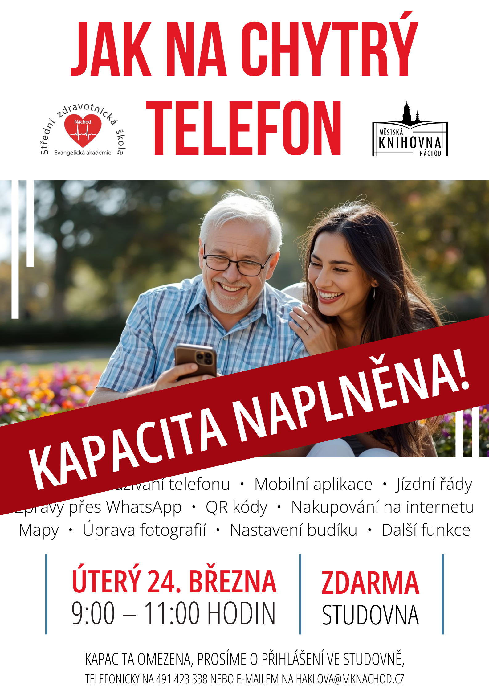 V úterý 24. března zveme od 9:00 hodin do studovny každého, kdo si chce osvojit základy používání chytrého telefonu v klidném tempu. Individuální přístup poskytnou studenti náchodské Střední zdravotnické školy – Evangelické akademie.