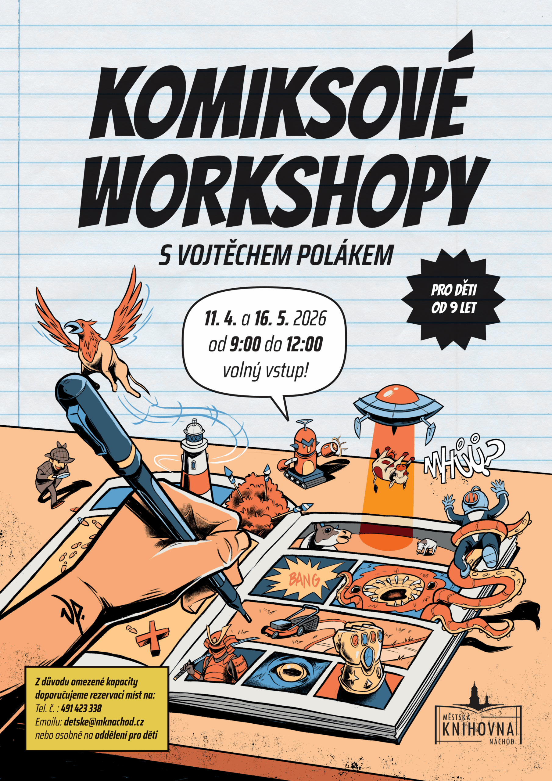 Komiksové workshopy s ilustrátorem Vojtěchem Polákem budou probíhat v sobotu 11. dubna a 16. května 2026 vždy od 9:00 do 12:00 hodin. Jsou určeny dětem od 9 let a vstup na ně je zdarma.