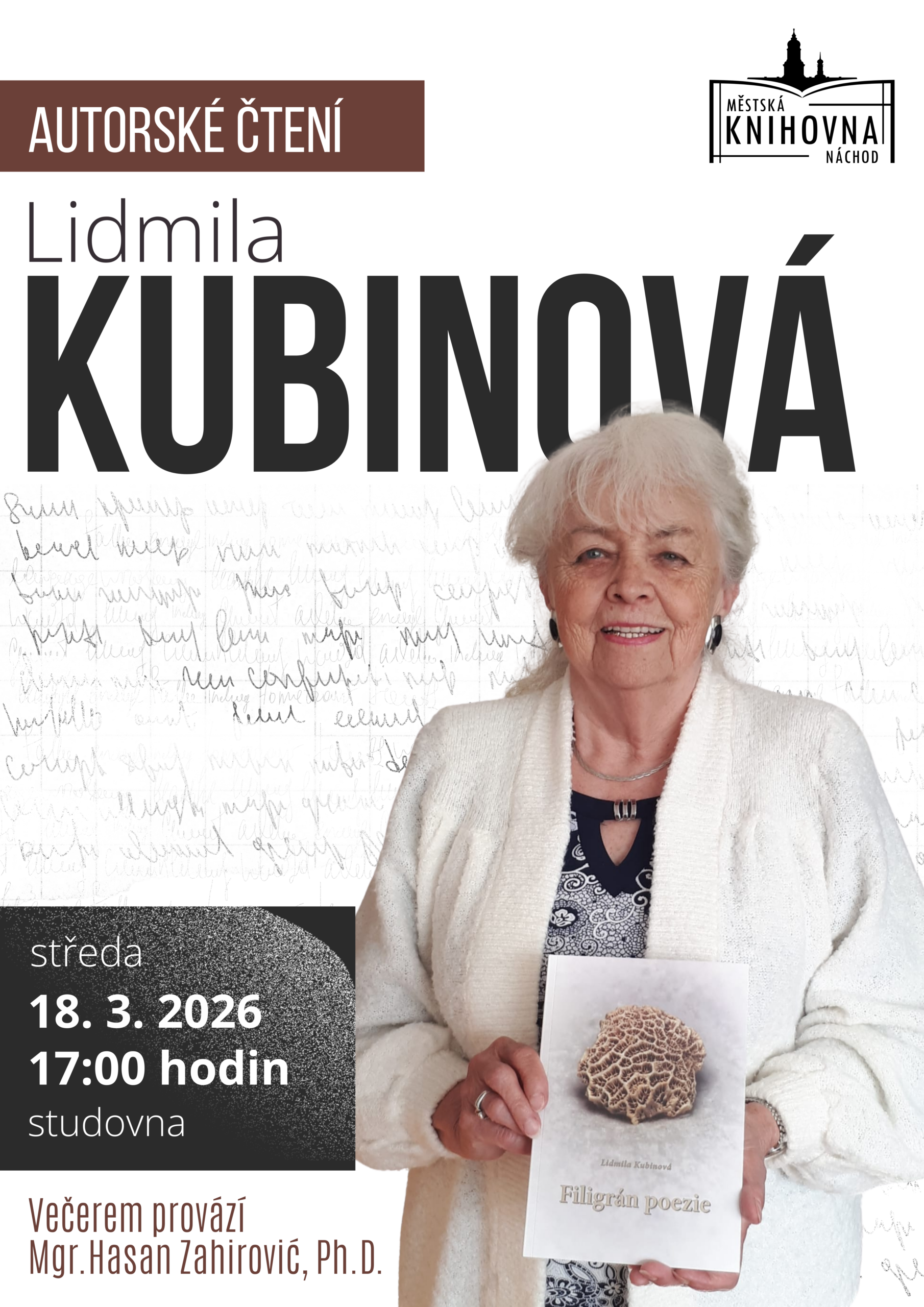 Ve středu 18. března vás od 17:00 hodin zveme do studovny na autorské čtení ze sbírky poezie regionální spisovatelky Lidmily Kubinové. Literárním večerem nás provede čapkolog a herec Hasan Zahirović.