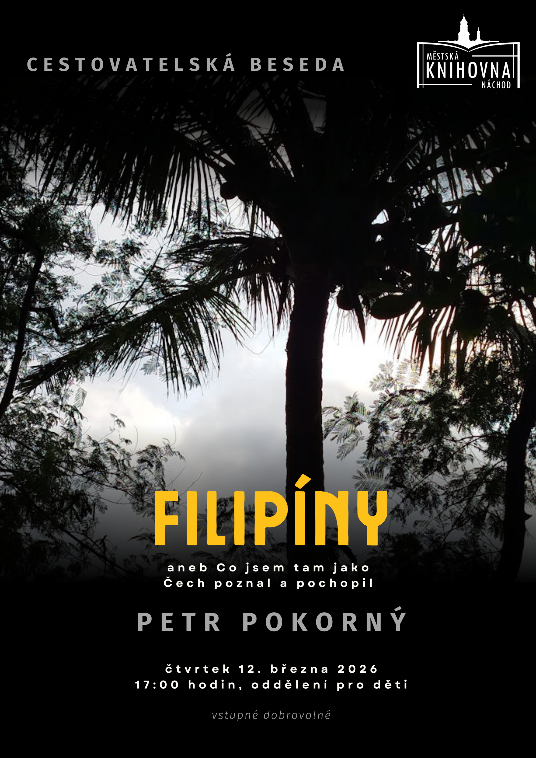 Petr Pokorný se v květnu loňského roku zúčastnil mezinárodní konference ochránců přírody A Rocha na Filipínách. Ve čtvrtek 12. března v 17:00 hodin přiblíží na besedě v dětském oddělení setkání s místními lidmi, rozmanitou přírodu i osobní postřehy, které si z cesty odvezl. Vstupné dobrovolné.