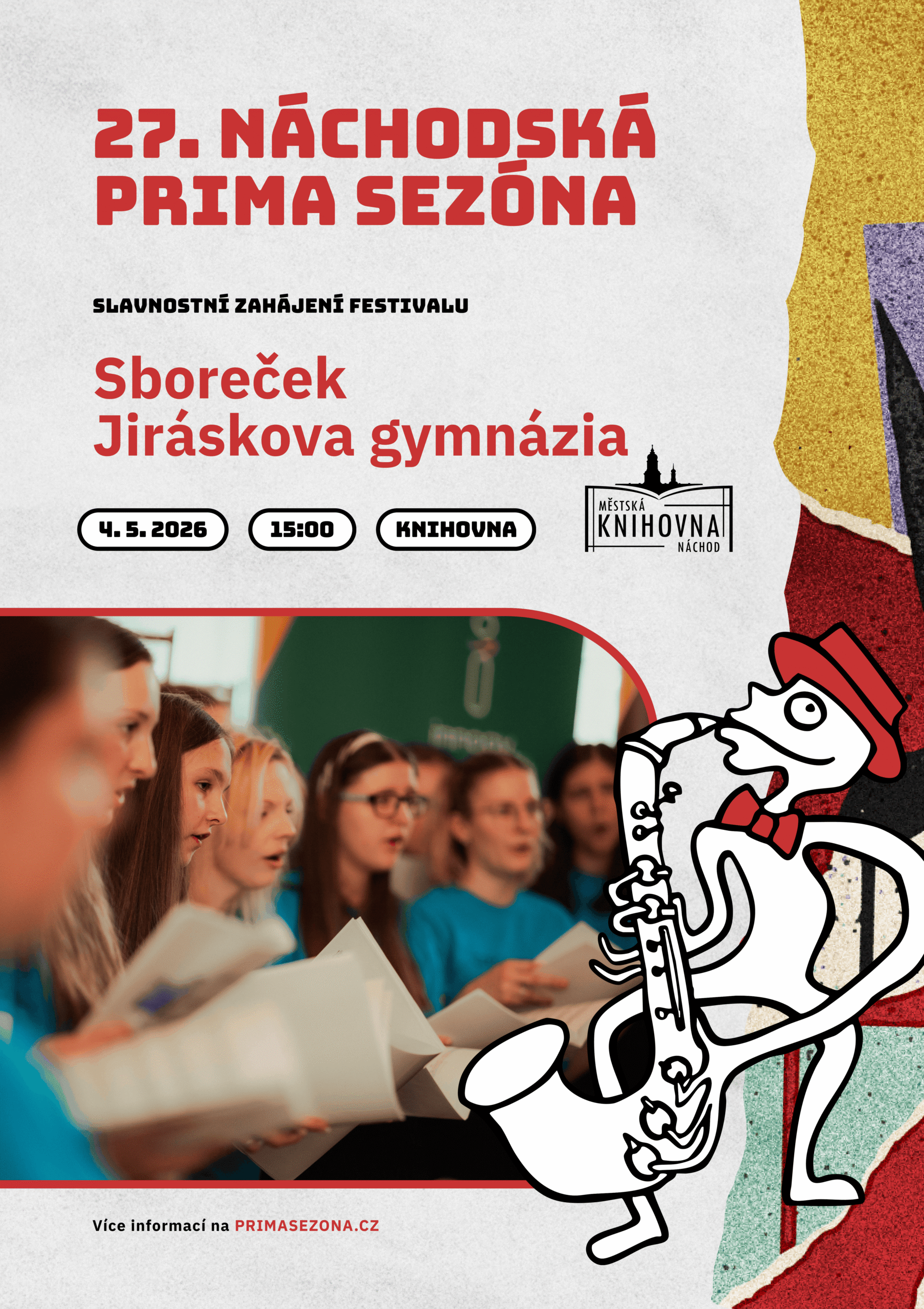 V pondělí 4. května zahájíme v 15:00 hodin 27. ročník Náchodské Prima sezóny – festivalu studentské tvořivosti, který každoročně představuje talent a nápaditost mladých tvůrců. Přijďte s námi a Sborečkem Jiráskova gymnázia Náchod otevřít letošní ročník a užít si inspirativní setkání s uměním v různých podobách.