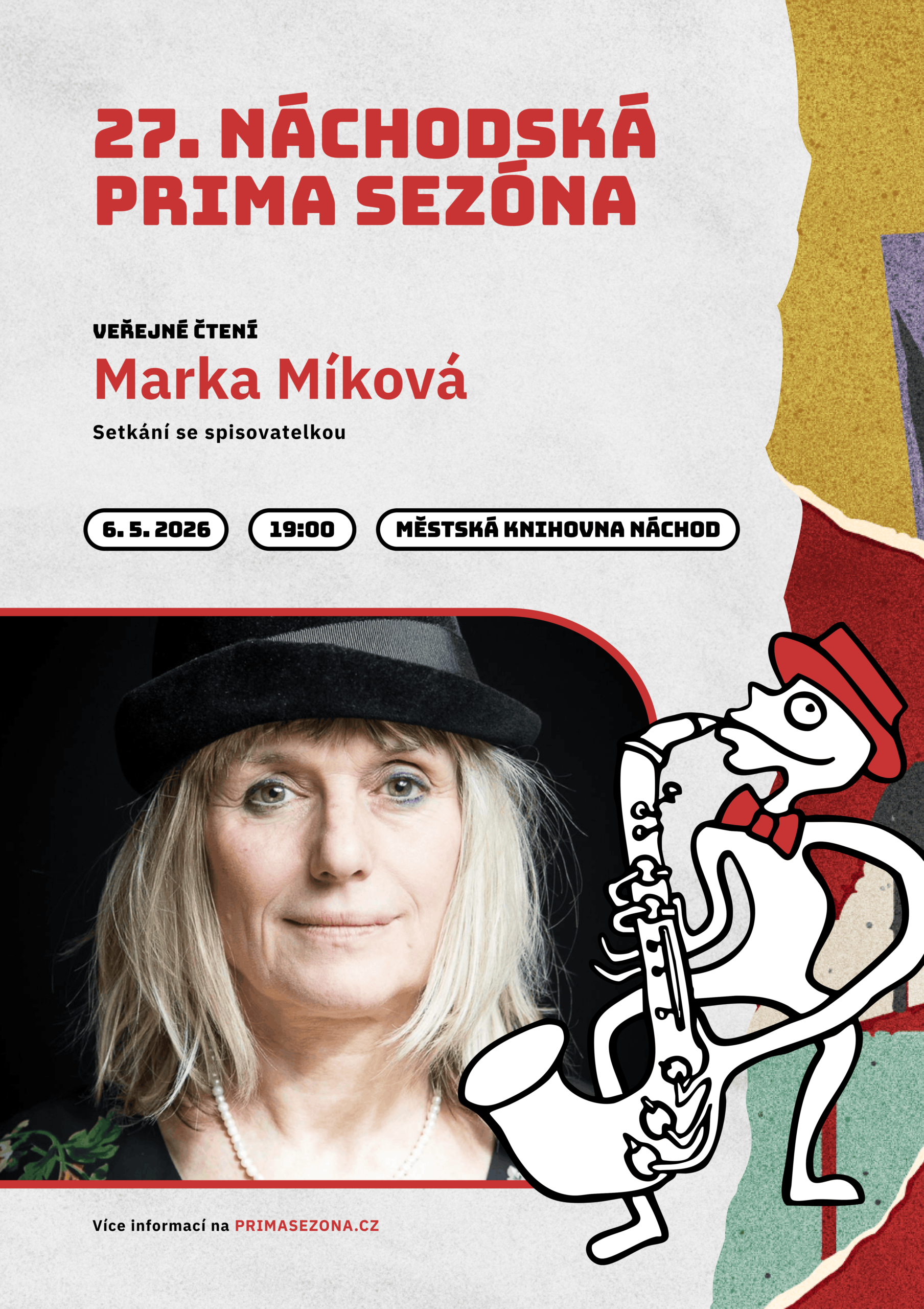 Ve středu 6. května od 19 hodin zveme na veřejné čtení v rámci 27. ročníku Náchodské Prima sezóny. Hostem večera bude spisovatelka Marka Míková, která představí vlastní tvorbu a nabídne příležitost nahlédnout do svého literárního světa.
