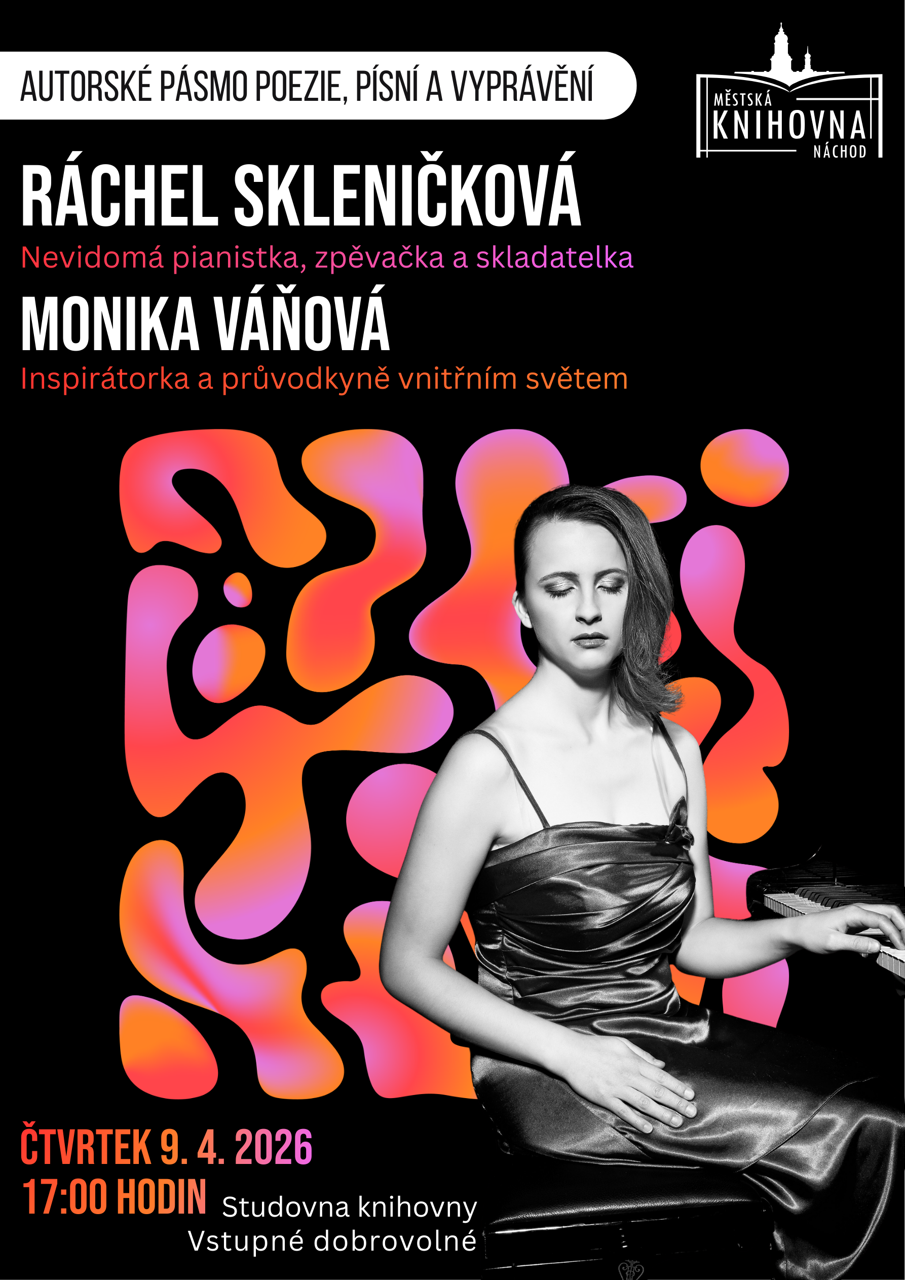 Ve čtvrtek 9. dubna pořádáme od 17:00 hodin ve studovně autorské pásmo nevidomé pianistky, zpěvačky a skladatelky Ráchel Skleničkové, která vystoupí společně s inspirátorkou a průvodkyní vnitřním světem Monikou Váňovou. Program propojí poezii, písně i vyprávění a nabídne tak setkání s hudbou i mluveným slovem. Vstupné dobrovolné.